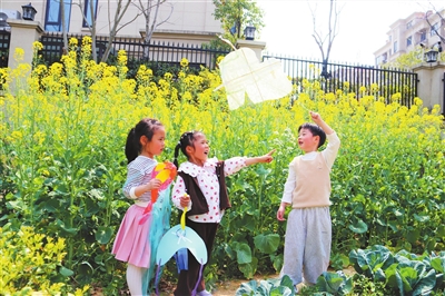 “兒童散學(xué)歸來早,忙趁東風(fēng)放紙鳶?!苯?,浙江省江山市江東科技幼兒園里的油菜花爭(zhēng)相斗艷,孩子們鉚足了勁兒比賽做風(fēng)箏。他們用塑料膜、紙板自制各種奇形怪狀的風(fēng)箏,并用彩筆繪制專屬圖案,通過研究風(fēng)向、風(fēng)力,調(diào)整風(fēng)箏的結(jié)構(gòu)、重量,努力讓風(fēng)箏翱翔天際。圖為孩子們?cè)诜棚w自制的風(fēng)箏。劉玉蘇 攝