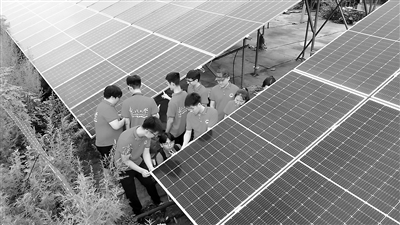 東北大學(xué)“智電興鄉(xiāng)”實(shí)踐團(tuán)成員在沈撫示范區(qū)拉古滿族鄉(xiāng)拉古村測量光伏板尺寸。學(xué)校供圖