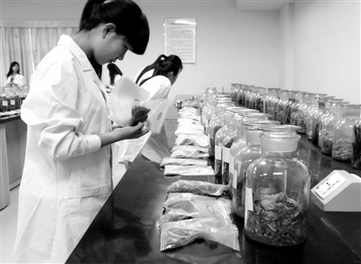 山東醫(yī)學(xué)高專中藥學(xué)專業(yè)學(xué)生在標本實驗室做中藥材鑒別實驗。學(xué)校供圖