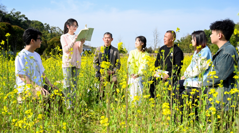 學(xué)生在油菜花田里朗讀農(nóng)民詩人的原創(chuàng)詩歌。李諶涵 攝