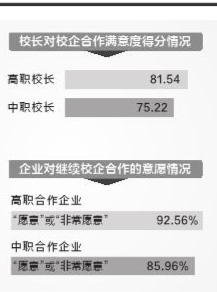 校企雙方對校企合作均表示滿意。調(diào)查結(jié)果顯示,高職和中職校長對學(xué)校開展校企合作呈現(xiàn)出較高滿意度,分別為81.54分和75.22分;其中中職校長對校企合作的滿意度較2019年上一輪調(diào)查結(jié)果提高了6.93分。高職學(xué)生和中職學(xué)生對學(xué)校從企業(yè)請來的教師教學(xué)水平表示非常滿意,分別得分84.98分和84.33分。有與職業(yè)學(xué)校合作經(jīng)驗(yàn)的企業(yè),較為頻繁開展產(chǎn)教融合活動(dòng)的企業(yè)數(shù)量占比78.83%,其中最主要的合作形式為接受實(shí)習(xí)生、到校開展招聘活動(dòng)以及到校開展職業(yè)生涯規(guī)劃和發(fā)展宣傳。絕大多數(shù)企業(yè)在與職業(yè)學(xué)校開展校企合作、產(chǎn)教融合活動(dòng)的過程中都有所收獲,特別是“降低企業(yè)培訓(xùn)成本”“降低企業(yè)招聘難度”“提升企業(yè)知名度”方面,選擇“沒有明顯收獲”的企業(yè)數(shù)量僅占2.18%。與職業(yè)學(xué)校合作的用人單位,對校企合作、產(chǎn)教融合開展效果的整體滿意度均相對較高,此次調(diào)查中有87.82%的企業(yè)表示對合作成效滿意。其中,與高職學(xué)校合作過的企業(yè)有92.56%表示“愿意”或“非常愿意”繼續(xù)合作,與中職學(xué)校合作過的企業(yè)有85.96%表示“愿意”或“非常愿意”繼續(xù)合作。