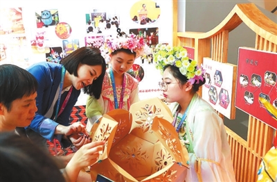 4月26日,第八屆中小學(xué)生藝術(shù)展演活動(dòng)全國(guó)匯演實(shí)踐活動(dòng)成果(工作坊)展示現(xiàn)場(chǎng),一名觀眾(左一)興致勃勃地與福建省泉州市通政中心小學(xué)“拾光花燈”藝術(shù)實(shí)踐工作坊的師生一起制作花燈。 本報(bào)記者 張學(xué)軍 攝