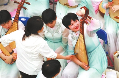 4月26日,第八屆中小學(xué)生藝術(shù)展演活動(dòng)全國(guó)匯演器樂(lè)專場(chǎng),候場(chǎng)期間,一名老師在仔細(xì)檢查學(xué)生的樂(lè)器。 本報(bào)記者 張學(xué)軍 攝