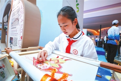 4月26日,第八屆中小學(xué)生藝術(shù)展演活動(dòng)全國(guó)匯演實(shí)踐活動(dòng)成果(工作坊)展示現(xiàn)場(chǎng),湖南省長(zhǎng)沙市雨花區(qū)育新小學(xué)學(xué)生在進(jìn)行湘繡非遺展示活動(dòng)。 本報(bào)記者 單藝偉 攝