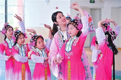 5月8日,在四川省眉山市仁壽縣鰲峰小學(xué)校,戲曲教師正在指導(dǎo)學(xué)生練習(xí)戲曲。近年來(lái),該校將傳統(tǒng)戲曲引進(jìn)校園,通過(guò)社團(tuán)活動(dòng)、主題課程、集中展演等形式,讓學(xué)生感受傳統(tǒng)文化的魅力。潘建勇 攝