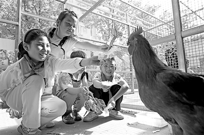 5月8日,在江蘇省徐州市睢寧縣第二小學(xué),參加勞動課的學(xué)生給雞、鴨、鵝、小兔子等動物投喂食物。該校在校園內(nèi)打造了一個生態(tài)鏈“動物園”,通過飼養(yǎng)小動物,培養(yǎng)學(xué)生們的責(zé)任心與吃苦耐勞精神。 洪星 攝