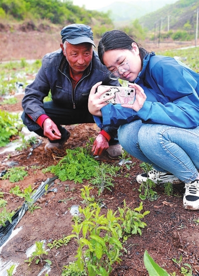 ? 在河北省承德市灤平縣金溝屯鎮(zhèn)大楊樹溝門村,沈陽(yáng)農(nóng)業(yè)大學(xué)園藝學(xué)院園藝專業(yè)2023級(jí)學(xué)生蘇乙桐(右)用手機(jī)記錄一戶藥材種植戶家里種的蒼術(shù)的生長(zhǎng)情況。