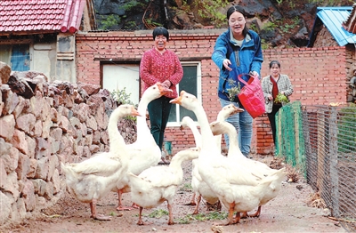 ? 蘇乙桐到姑姑家了解庭院經(jīng)濟(jì)發(fā)展情況時(shí),給大鵝投喂青草。