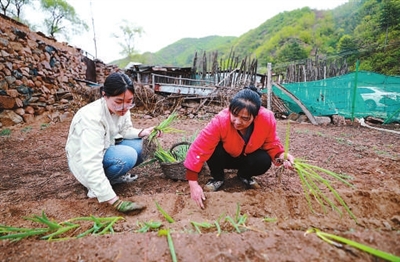 ? 蘇乙桐和媽媽一起在自家院壩栽大蔥。