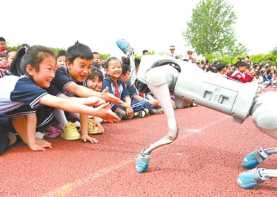 5月13日,在江蘇省徐州市睢寧縣李集鎮(zhèn)中心小學(xué)科普活動(dòng)現(xiàn)場(chǎng),學(xué)生在和智能機(jī)器狗互動(dòng)。近日,由江蘇省婦女兒童基金會(huì)、省青少年科技中心聯(lián)合開展的“百??破招小破者M(jìn)校園”活動(dòng)走進(jìn)李集鎮(zhèn)中心小學(xué),通過豐富多彩的科學(xué)教育活動(dòng),培育青少年的科學(xué)意識(shí)和動(dòng)手實(shí)踐能力,點(diǎn)亮孩子們的科學(xué)夢(mèng)想。洪星 攝