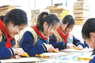 近日,記者走進(jìn)學(xué)?!凹遵R木刻版畫工作坊”社團(tuán)興趣課,學(xué)生們用小刻刀在木板上刻印作畫,草稿圖上有動(dòng)物、有人物、有傳統(tǒng)節(jié)日符號(hào)等,大家一次次推出木屑,在時(shí)而抬頭的交流中綻放歡笑,更多時(shí)候則是沉浸其中,專注創(chuàng)作。