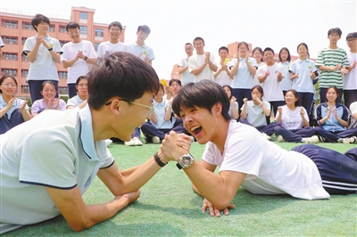 5月22日,在山東省高密市第五中學,高三學生比賽掰手腕。