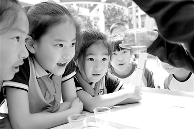 山東省威海高區(qū)第一小學學生在學?!皩嶒炐銏觥被顒又杏^察實驗操作過程。學校供圖