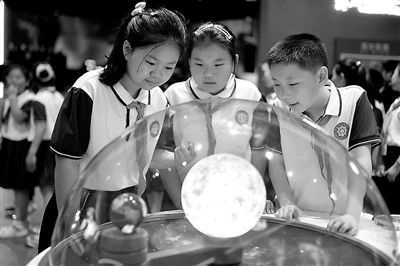 左圖:5月25日,山東省青島市市北區(qū)開平路小學(xué)學(xué)生在青島科技館參觀“潮汐”裝置。