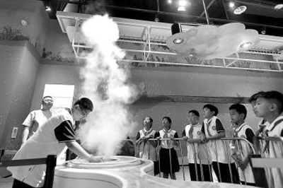 上圖:5月25日,山東省青島市市北區(qū)開平路小學(xué)學(xué)生在青島科技館體驗(yàn)“空氣炮”裝置。
