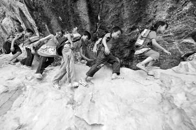 小圖:10歲的蒙富松(左一)爬懸崖去學(xué)校讀書(2012年9月3日攝)。