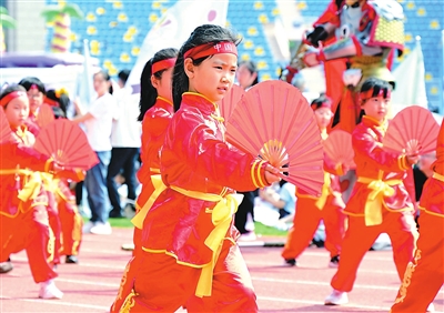 5月30日,青島鎮(zhèn)江路小學(xué)學(xué)生表演太極扇?!傲弧眹?guó)際兒童節(jié)臨近,孩子們?cè)谪S富多彩的活動(dòng)中迎接屬于自己的節(jié)日。 新華社記者 李紫恒 攝