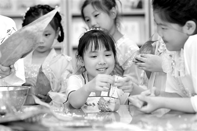 右圖:5月26日,山東省青島市市北區(qū)杭州路小學(xué)學(xué)生在體驗(yàn)包粽子。王海濱 攝