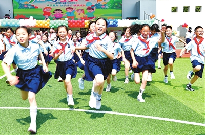 5月30日,浙江省建德市明珠小學學生在操場上歡樂奔跑。