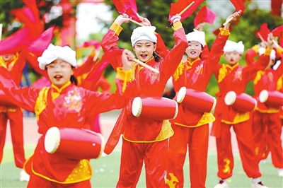 5月30日,甘肅省定西市安定區(qū)福臺小學腰鼓社團的學生在表演。