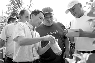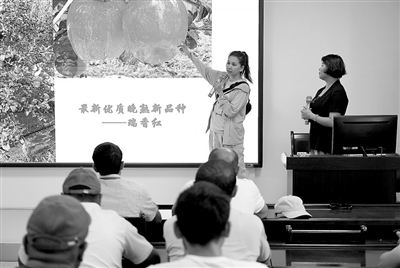 6月16日,在位于陜西省渭南市白水縣的西北農(nóng)林科技大學(xué)蘋果試驗站,老師和翻譯為培訓(xùn)班學(xué)員介紹中國蘋果新品種。