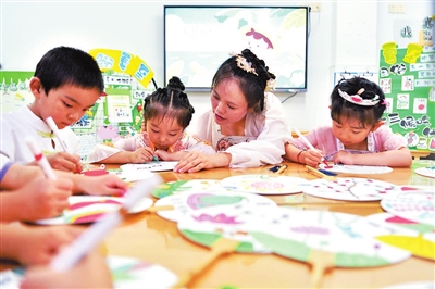 6月20日,夏至即將到來,在湖北省襄陽市??悼h縣直機關(guān)第二幼兒園,教師指導(dǎo)孩子畫團扇。楊韜 龔雪 攝