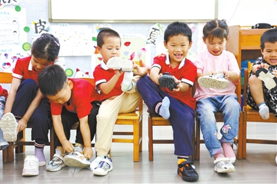 日前,浙江省諸暨市暨南街道街亭幼兒園開展了一場(chǎng)別開生面的幼兒自理能力比賽活動(dòng),孩子們通過(guò)穿鞋子、折疊被子、整理書本等形式,展示和提升自己的生活技能。圖為孩子們比賽穿鞋子。陳霞芳 攝