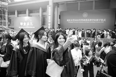 6月28日,重慶大學2025年畢業(yè)典禮暨學位授予儀式現(xiàn)場,學生合影留念。當天,該校1.5萬名畢業(yè)生懷揣對未來的憧憬和期望,即將踏上人生新的征程。重慶大學校長王樹新以“堅韌”為題,為全體畢業(yè)生帶來一堂“青春揚帆新時代”的畢業(yè)課程。