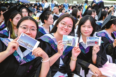 在山東第一醫(yī)科大學(xué)畢業(yè)典禮現(xiàn)場,幾名畢業(yè)生手持學(xué)校文創(chuàng)明信片合影留念,定格青春記憶。張家興 攝
