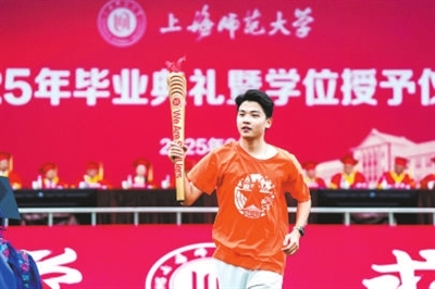 在上海師范大學(xué)2025年畢業(yè)典禮暨學(xué)位授予儀式上,畢業(yè)生傳遞火炬,寓意薪火相傳、播撒希望。學(xué)校供圖