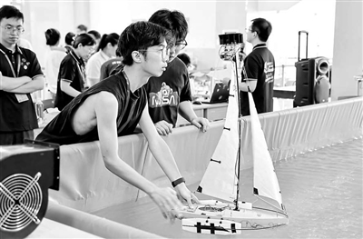在由江蘇科技大學(xué)舉辦的第十三屆全國海洋航行器設(shè)計(jì)與制作大賽暨首屆船舶與海洋工程類教師教學(xué)創(chuàng)新大賽上,參賽隊(duì)員對航行器進(jìn)行調(diào)整。 江蘇科技大學(xué)供圖 (資料圖片)