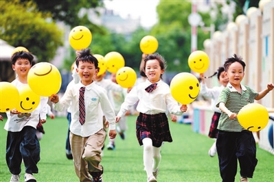 圖① 浙江省湖州市長興縣實驗幼兒園,孩子們手舉笑臉氣球奔跑。譚云俸 攝