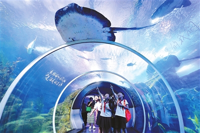 近日,山東省青島市市北區(qū)東勝路小學(xué)的孩子們在“海底隧道”觀賞蝠鲼等海洋魚類。暑假期間,孩子們走進(jìn)青島海底世界展區(qū),通過與海洋動(dòng)物近距離接觸、觀賞生物標(biāo)本等過程,學(xué)習(xí)海洋知識(shí),充實(shí)假期生活。 王海濱 攝