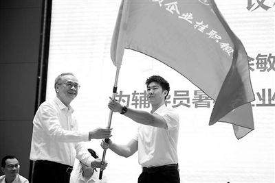 西南交通大學(xué)黨委書記余敏明為輔導(dǎo)員暑期企業(yè)掛職鍛煉實(shí)踐隊(duì)授旗。葛仁鑫 攝