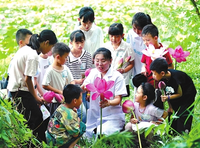 近日,四川省綿陽市梓潼縣自強(qiáng)鎮(zhèn)黎明村荷花園,鎮(zhèn)中心衛(wèi)生院中醫(yī)藥師為自強(qiáng)小學(xué)學(xué)生講解荷花的觀賞、食用性和藥用性價(jià)值。夏日荷花盛開,當(dāng)?shù)亻_展“‘荷’其有趣 中醫(yī)科普”暑期研學(xué)活動(dòng),讓學(xué)生感受“荷花”藥食同源的功能和中醫(yī)藥文化的博大精深。 成和平 攝