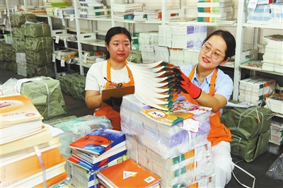 8月12日,工作人員在河北省新樂市新華書店倉庫整理清點中小學(xué)教材,準(zhǔn)備送往各學(xué)校。賈敏杰 攝