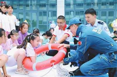 8月12日,江蘇省宿遷市公安局宿城分局太湖路派出所民警聯(lián)合藍(lán)天救援志愿服務(wù)隊志愿者走進(jìn)轄區(qū)暑托班,向?qū)W生宣講防溺水安全知識和救援技能,提高學(xué)生的自我防范能力,筑牢防溺水安全防線。 王力 陳曉 攝