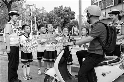 8月13日,在安徽省蕪湖市繁昌區(qū)繁陽鎮(zhèn)五華山路口,“小交警”在交警的帶領下向市民宣傳交通安全知識。肖本祥 攝
