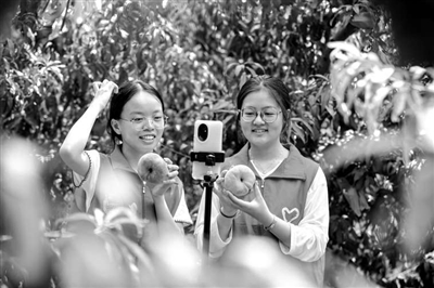 8月13日,在河北省邯鄲市復(fù)興區(qū)戶村鎮(zhèn)大滋然生態(tài)農(nóng)業(yè)有限公司,大學(xué)生在田間地頭直播銷售蟠桃。 聶長青 陳夢千 攝