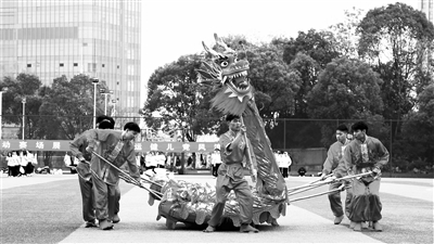 學(xué)生在運(yùn)動會開幕式上進(jìn)行舞龍舞獅表演。 汪洋 攝
