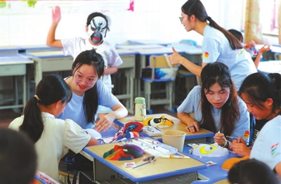 “這些臉譜背后藏著哪些英雄故事呀?”暑期,廣西桂林市興安縣高尚鎮(zhèn)中心小學的一間教室里,孩子們握著畫筆,專注地描畫關(guān)羽的丹鳳眼、包公的月牙,筆尖跳躍著朱砂紅,手中的臉譜熠熠生輝,仿佛歷史人物正對新時代的小傳人微笑。一旁,江蘇省鹽城師范學院支教大學生趙文秀臉上也露出了欣慰的笑容。