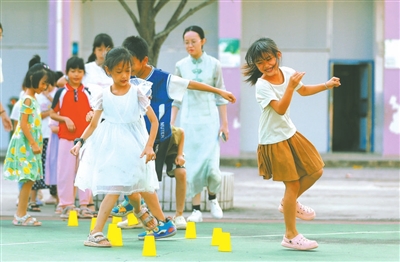 室外,連續(xù)3年赴桂支教的鹽城師范學院大學生黎曉文正帶著孩子們開展心理團輔活動。在“翻山越嶺接力賽”和“我是小小演說家”游戲中,學生們跨越障礙物到達終點后,分享了自己的夢想。
