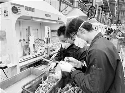 山東理工職業(yè)學(xué)院學(xué)生在合作企業(yè)比亞迪開展抽樣檢測(cè)汽車空調(diào)管路項(xiàng)目實(shí)習(xí)。