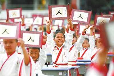 9月5日,貴州省黔東南苗族侗族自治州黃平縣新州鎮(zhèn)中心小學(xué)一年級(jí)新生展示自己剛剛寫好的“人”字。當(dāng)日,學(xué)校一年級(jí)新生身著儒生禮服參加“開筆禮”。通過莊重的“起筆描紅”“行拜師禮”等儀式,勉勵(lì)新生珍惜讀書機(jī)會(huì)、勤奮學(xué)習(xí),扣好人生“第一??圩印薄?梁文 攝