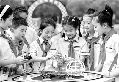 9月8日,江蘇省海安市城南實驗小學學生在了解無人機性能。近年來,該校將無人機、機器人等科技創(chuàng)新元素融入學校第二課堂,培養(yǎng)學生對科學技術的興趣和愛好,零距離感受科技魅力。