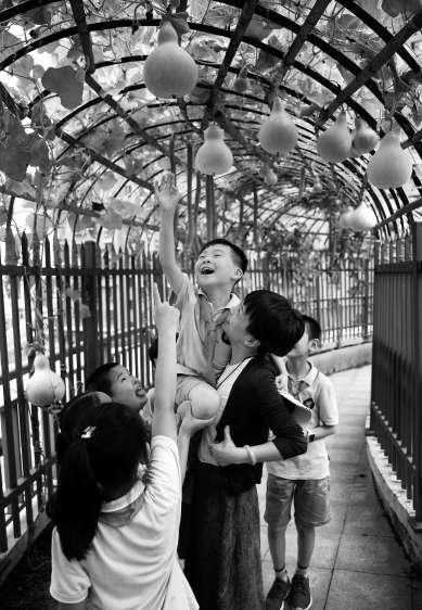 浙江省杭州市濮家小學(xué)學(xué)生在樓頂農(nóng)場采摘。 學(xué)校供圖